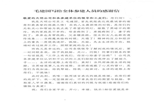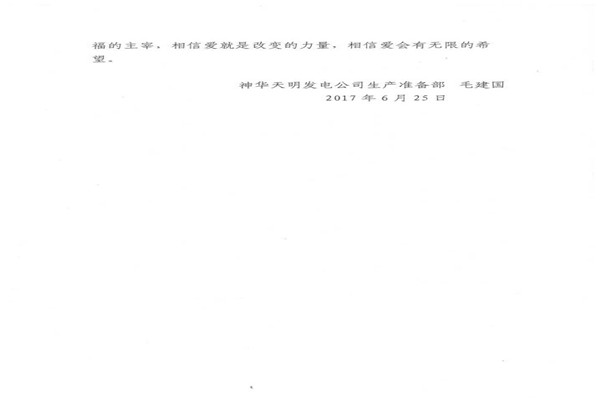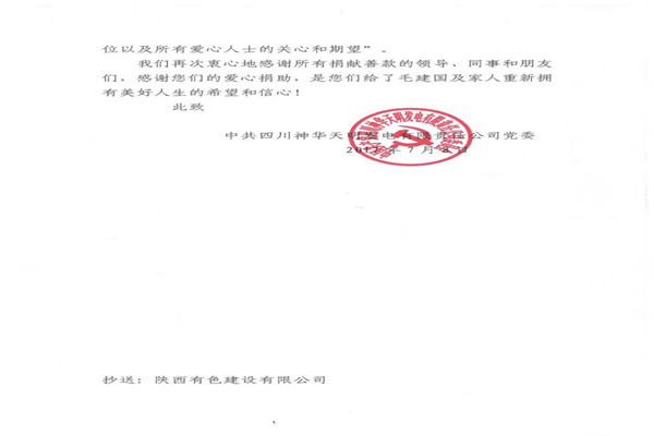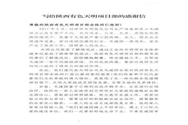 信中指出,神華天明發(fā)電公司員工毛建國家人長期患病,妻子又突發(fā)嚴(yán)重的心臟病,讓原本不富裕的家庭更是雪上加霜。在了解到相關(guān)情況后,神華天明項(xiàng)目部負(fù)責(zé)人高度重視,積極開展愛心捐款活動(dòng),為毛建國一家伸出了援助之手,幫助其度過難關(guān)。
